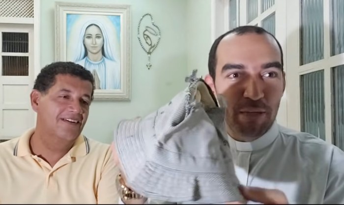 P. Gabriel: Si vede, io sono qui che lo maneggio con grande attenzione e tu invece lo stai strapazzando! Aggiungo che tante persone hanno indossato questo cappello e hanno ricevuto grazie e guarigioni dalla Madonna. Quindi è un cappello speciale, resterà custodito, non verrà esposto, ma resta nella storia di Anguera fino a che Dio lo permetterà.